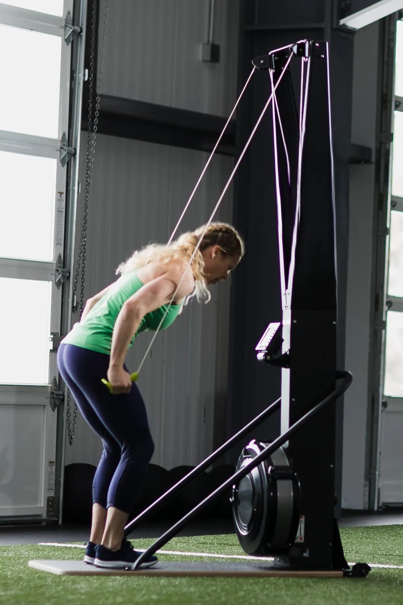 Full body endurance training equipment designed to simulate cross-country skiing and develop upper body power and cardiovascular performance.